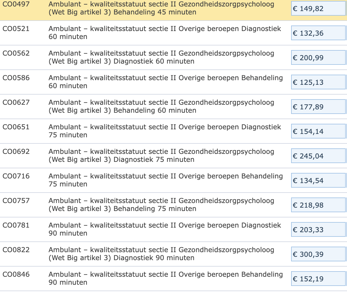 Vanaf 2022 wordt gewerkt met het zorgprestatiemodel Op de factuur staat wat voor consult je hebt gehad (diagnostiek of behandeling), hoe lang het consult duurde en door welke deskundige het werd uitgevoerd. In onderstaand overzicht vind je de tarieven van de meest voorkomende type consulten in mijn praktijk. Het gaat hierbij om de directe tijd (duur van het gesprek), de indirecte tijd voor verslaglegging, uitwerken vragenlijsten, opstellen behandelplan etc. is in dit tarief verrekend.